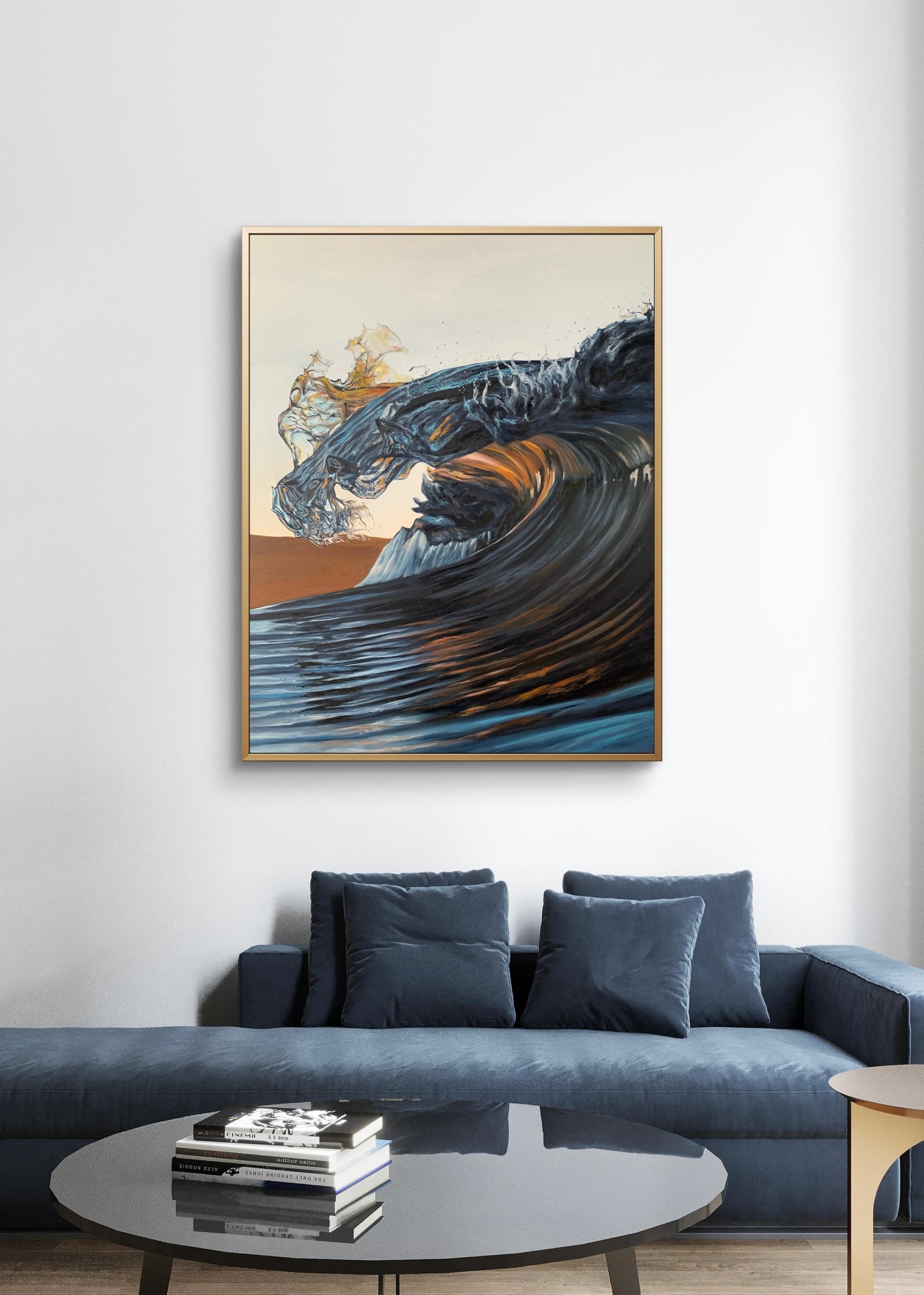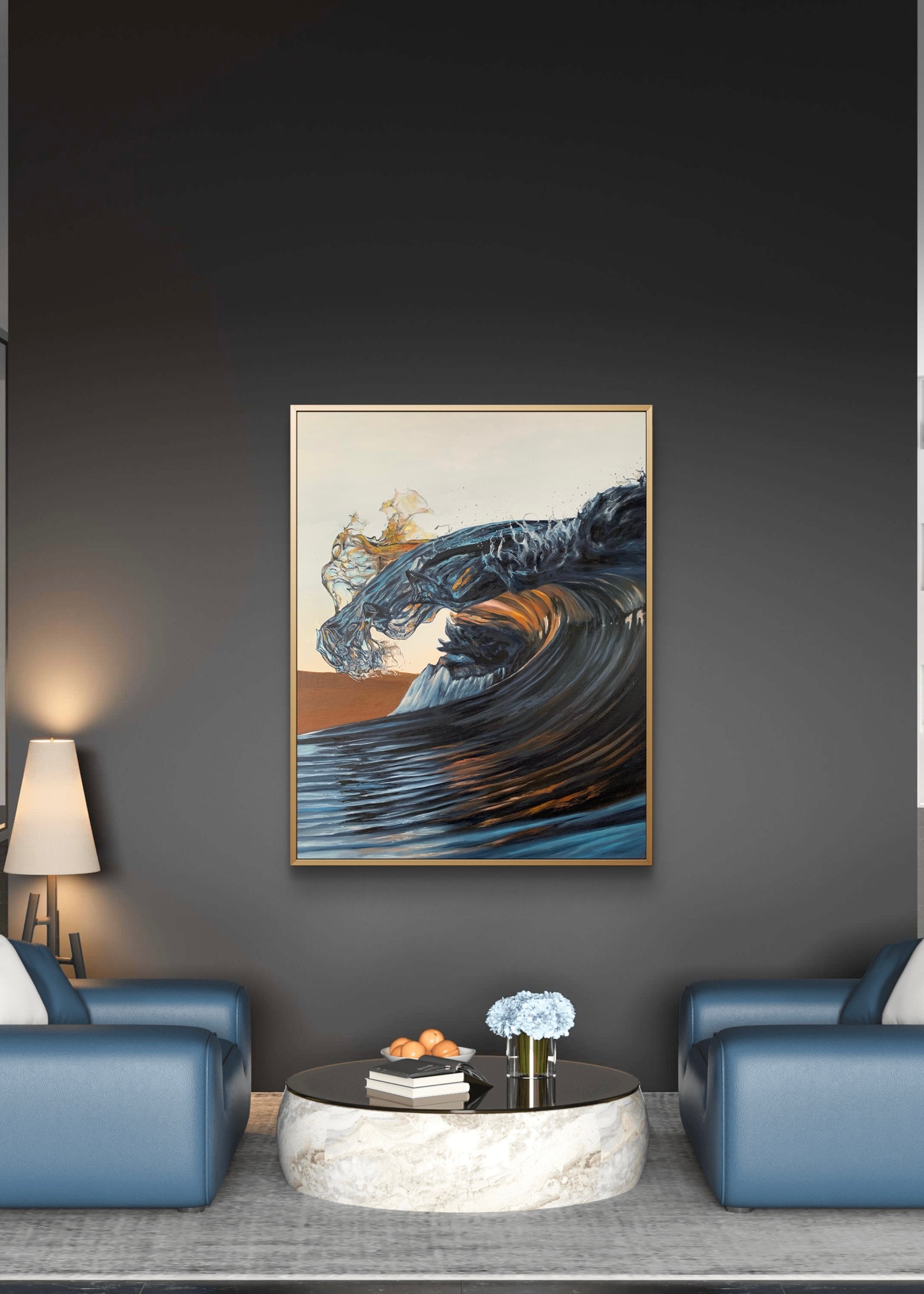 This oil painting portrays a sunset wave in deep blue and earthy brown tones, blending the calm of the sea with the warmth of the fading light. The harmonious colours evoke a tranquil moment where ocean and earth meet at dusk