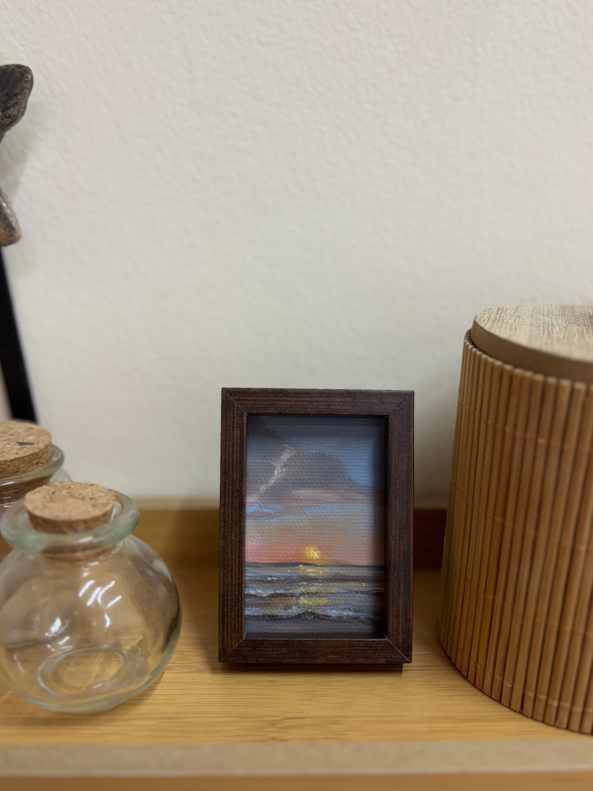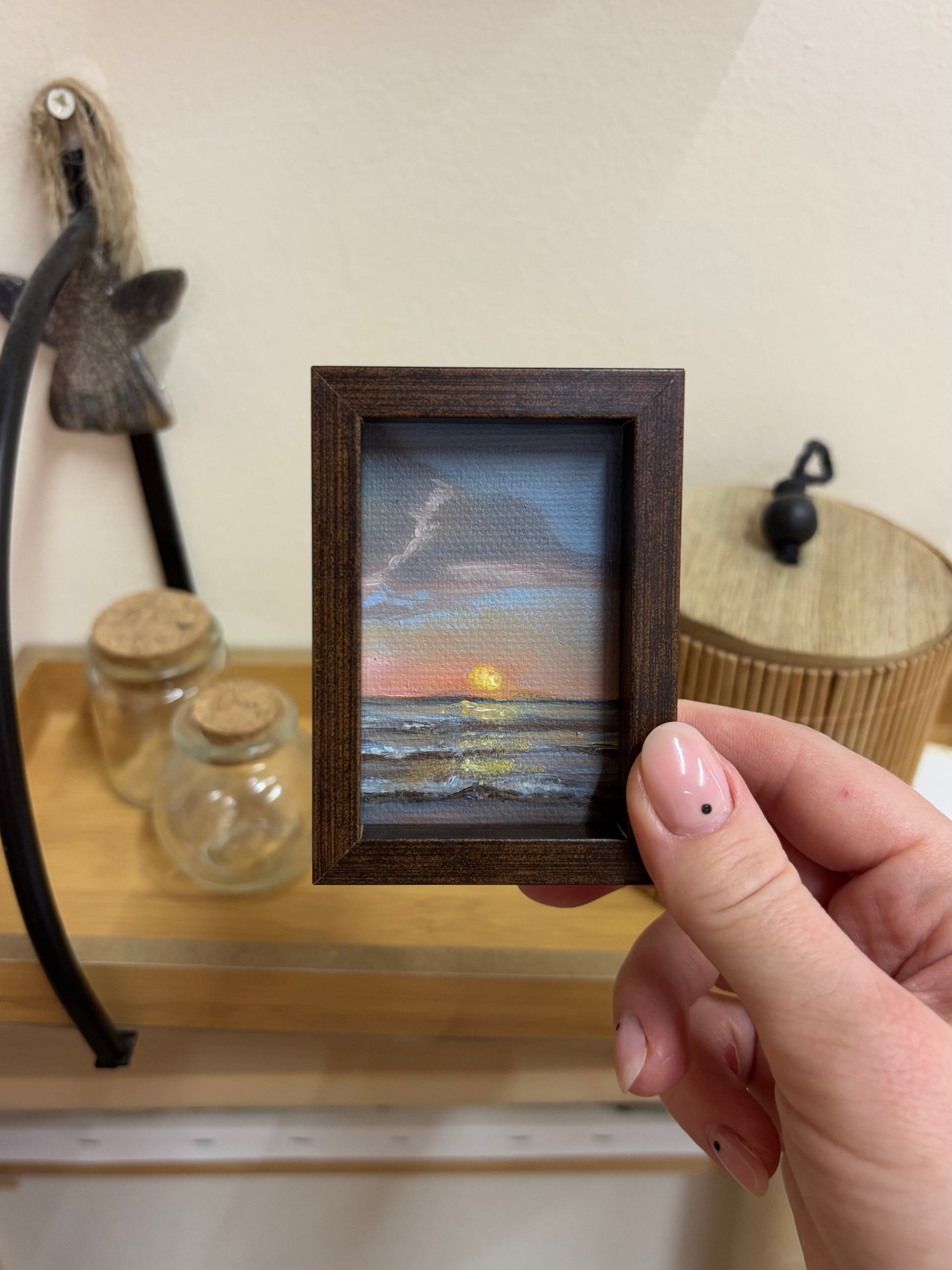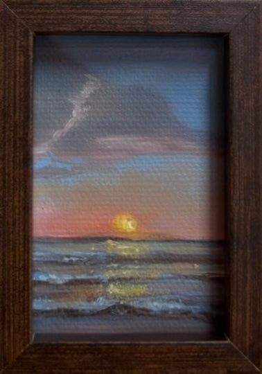 This sunset spills across the clouds, glowing with intensity and fading into gentle shadows. This miniature painting holds the drama of the sky in your hands..