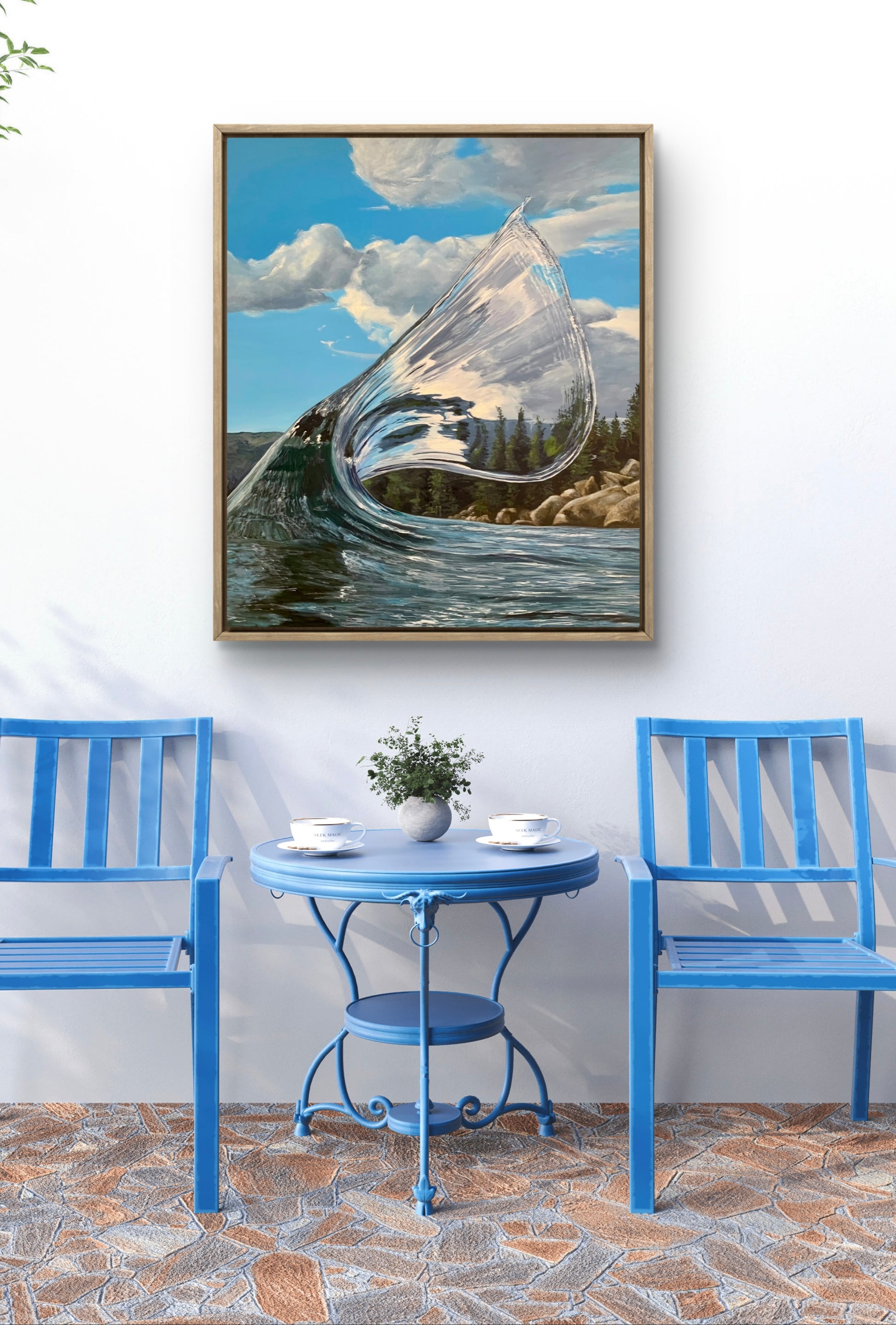 This oil painting captures the delicate transparency of a wave, revealing the light dancing through its crystal-clear form. The subtle shades of blue and white evoke the serene beauty of the lake's gentle flow