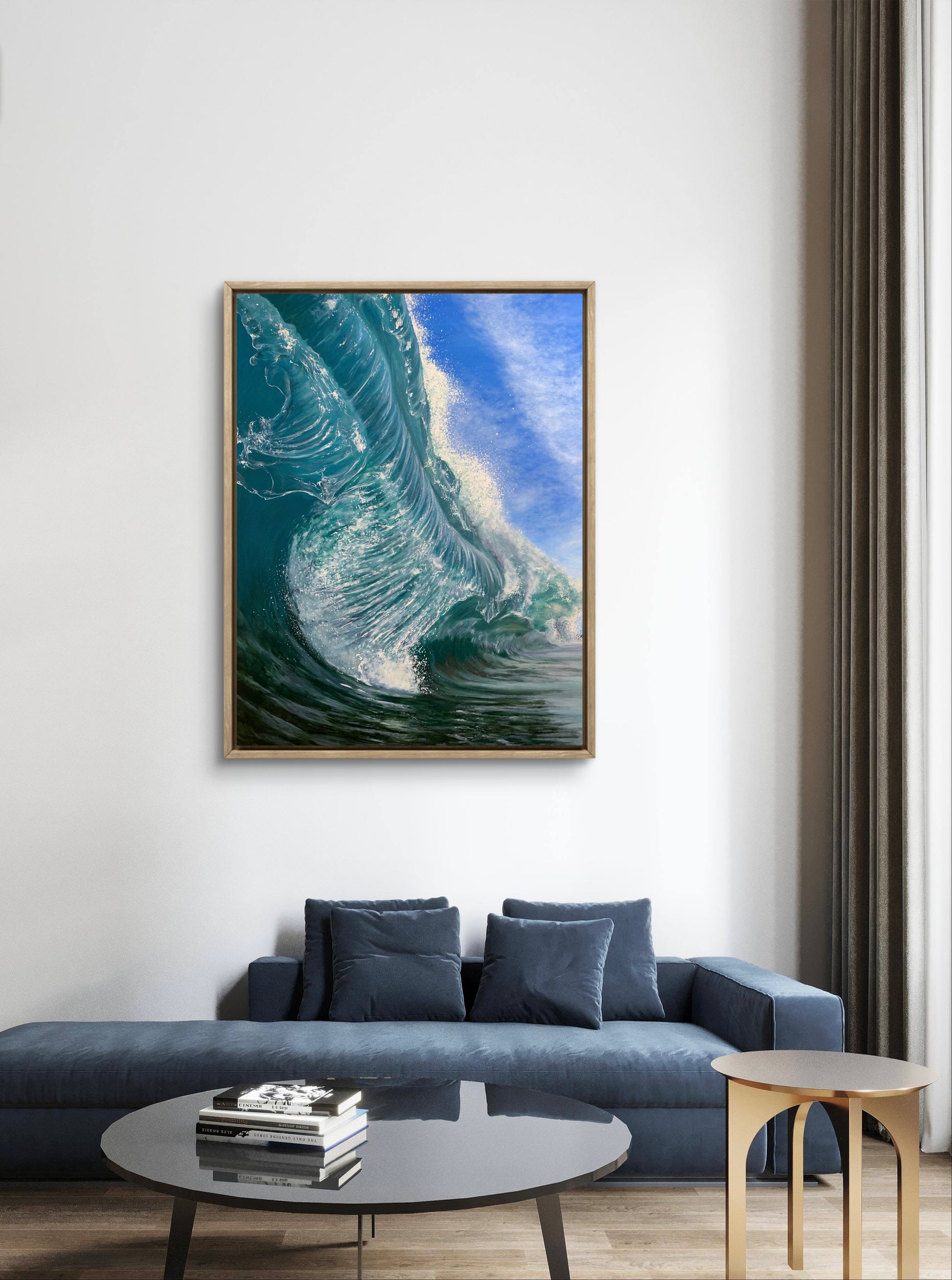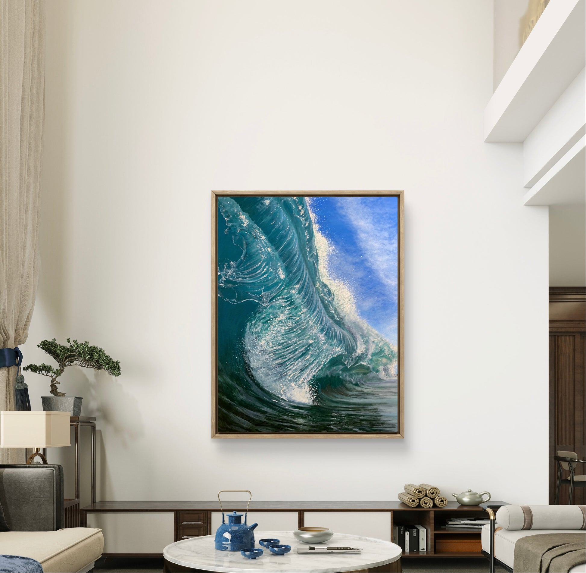 This oil painting captures the power of a large, dark turquoise wave as it rises with dramatic force. Deep tones and bold brushstrokes convey the strenght and mystery of the open sea