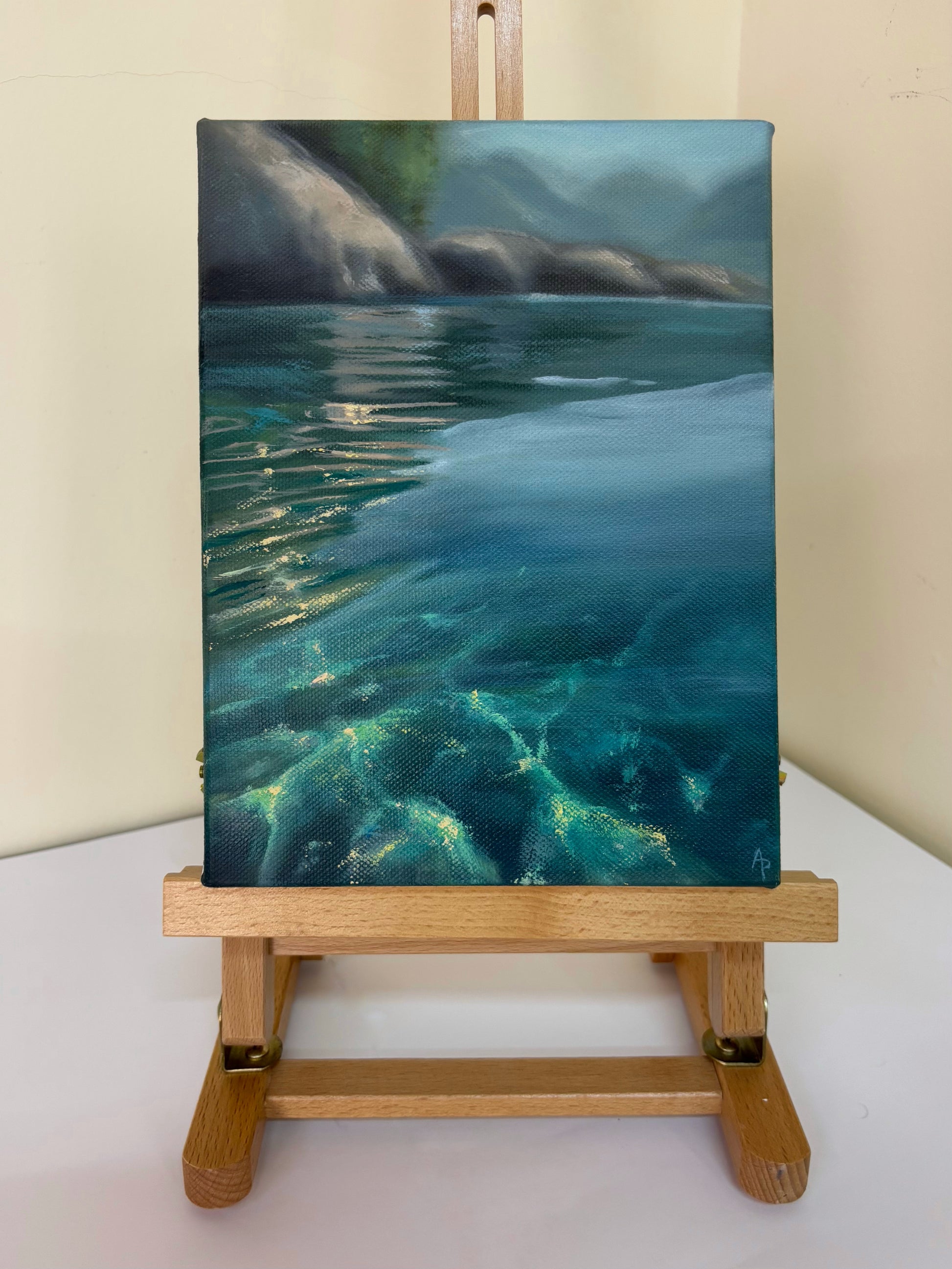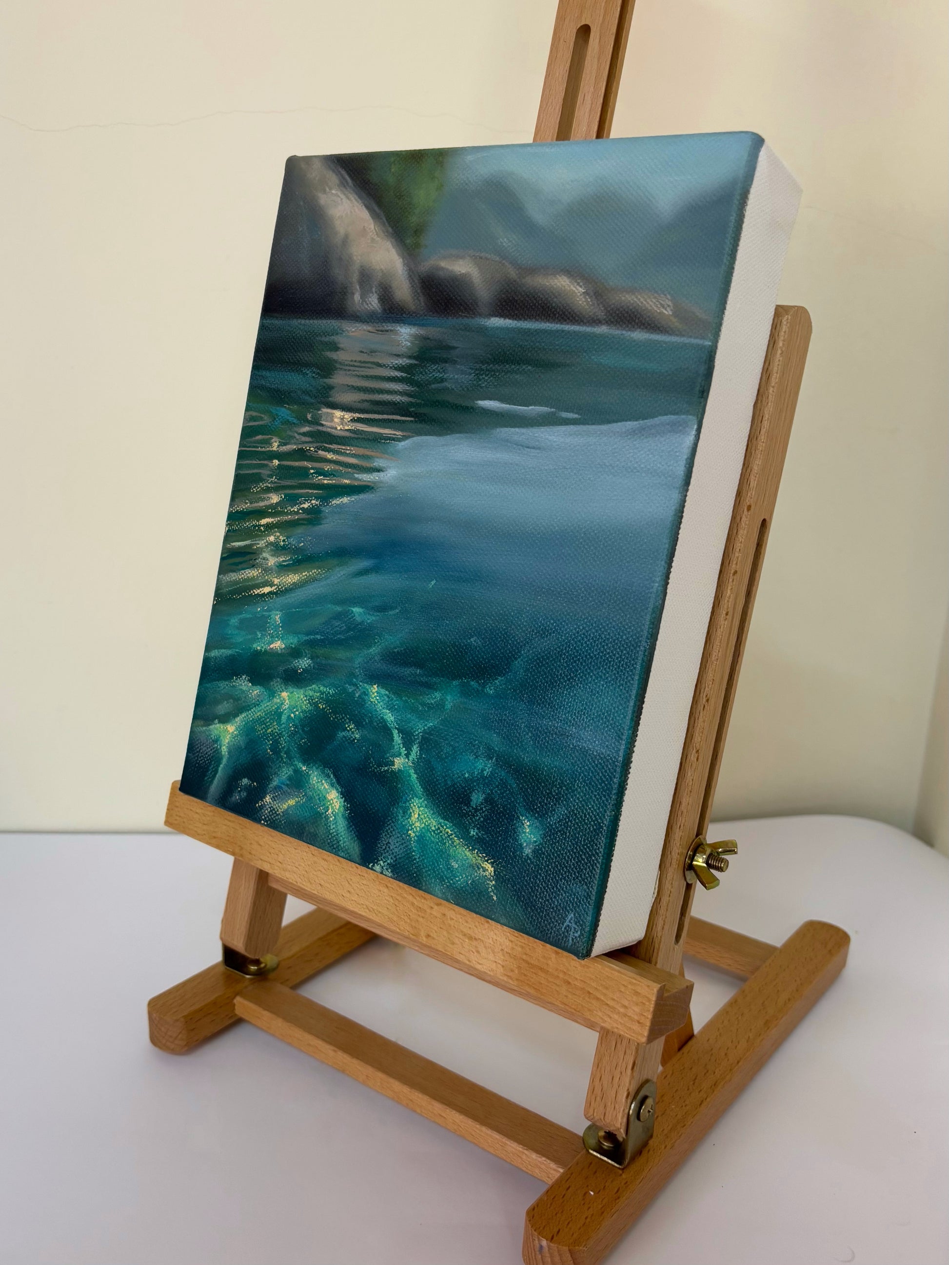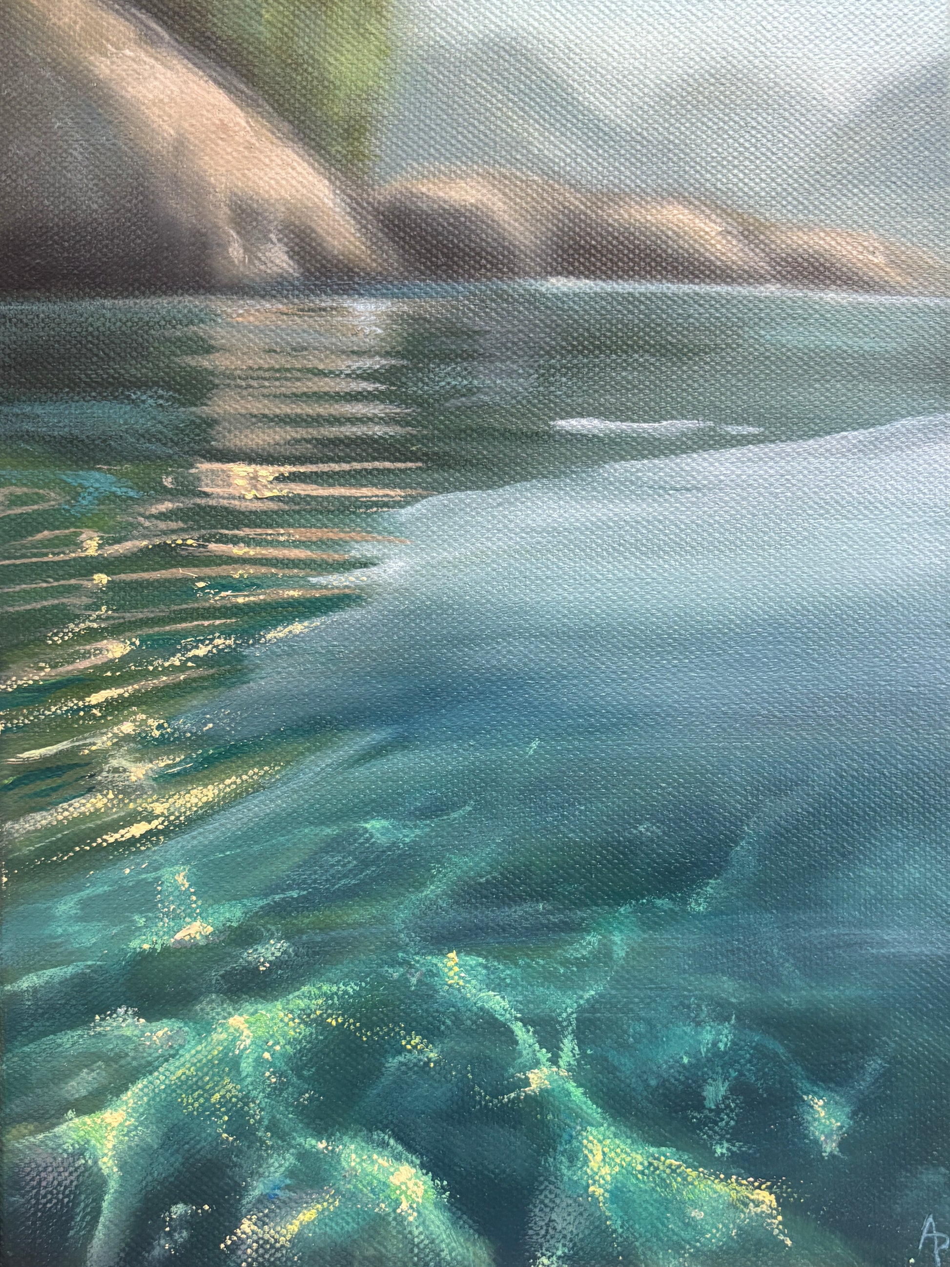 A serene glimpse into crystal-clear turquoise water, where sunlight dances across submerged rocks. This piece captures the calm rhythm of nature, evoking a feeling of peaceful stillness and depth.