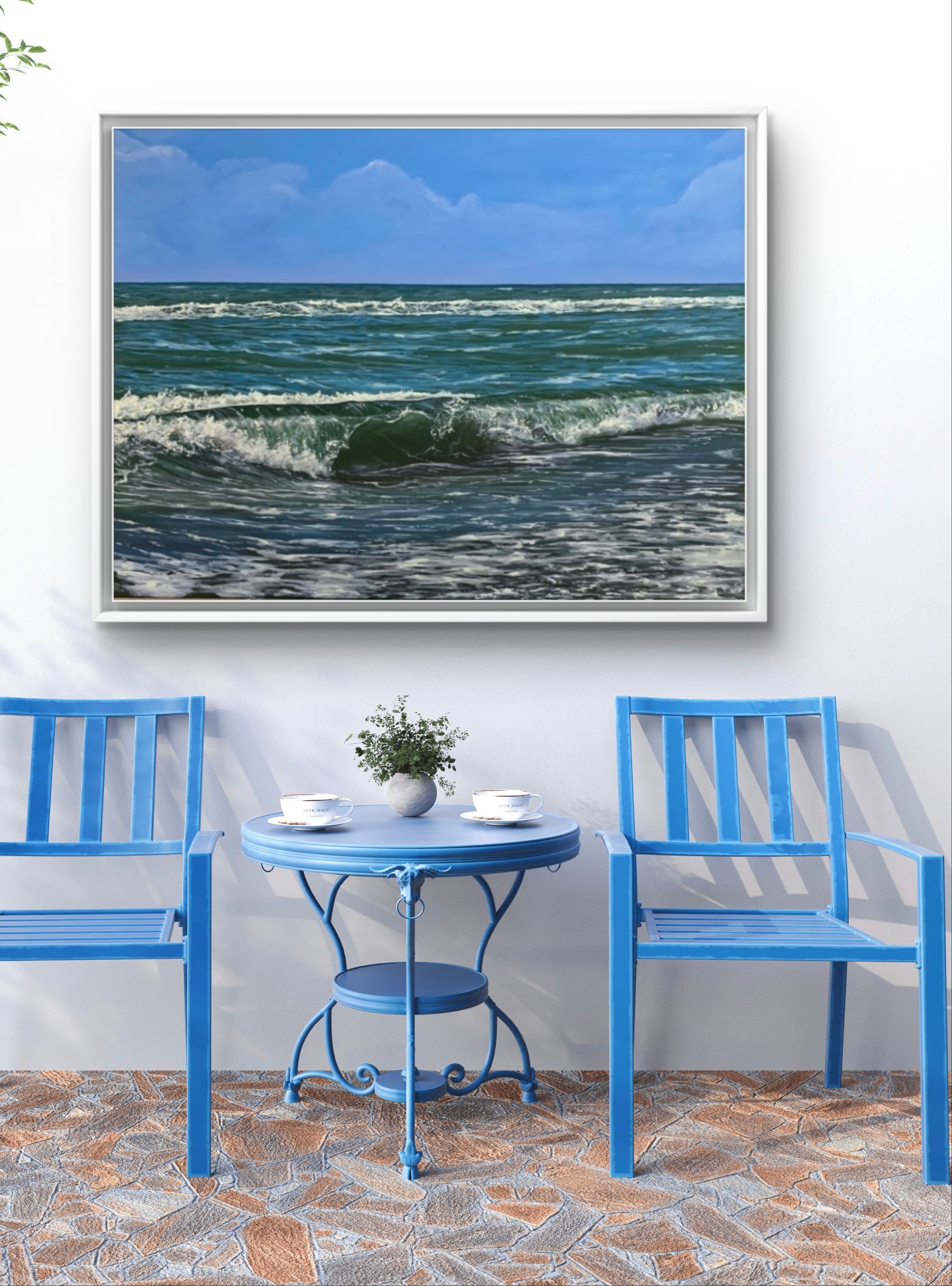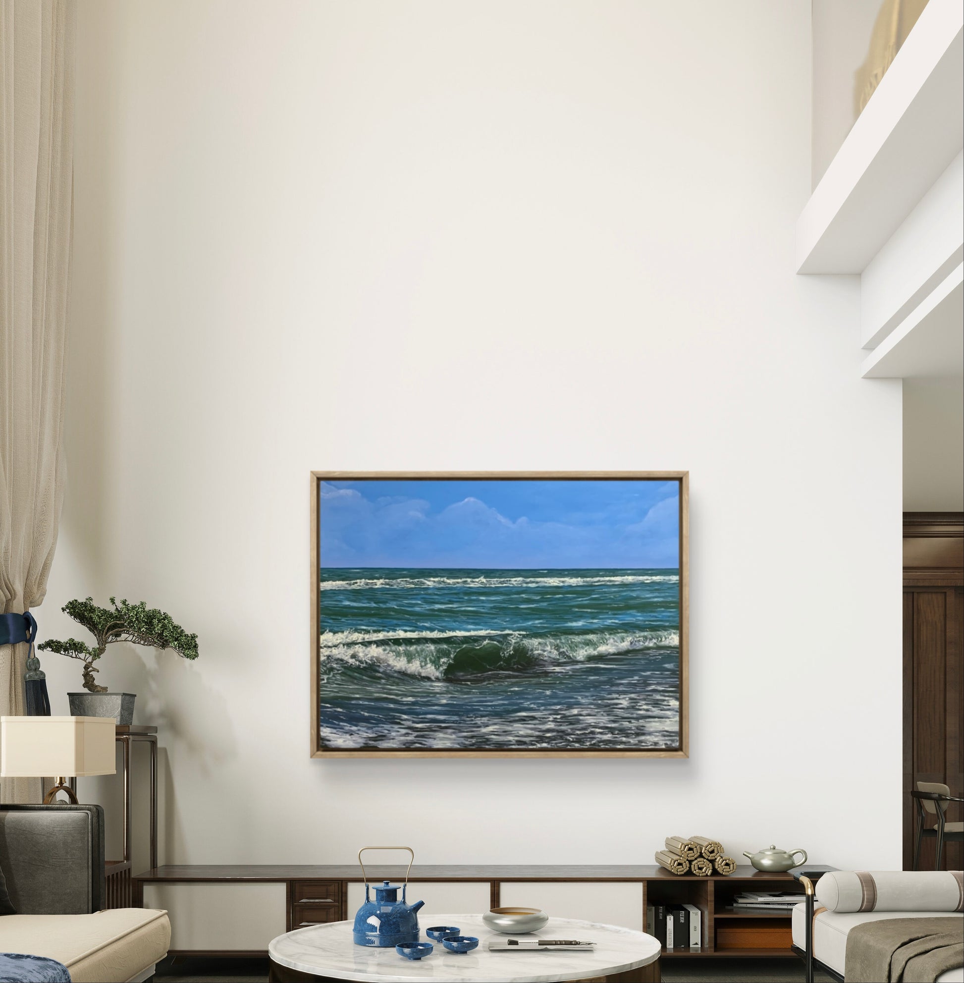 This oil painting depicts the tranquil shoreline of the Tyrrhenian Sea, rendered in soothing blue-green tones. Gentle waves and soft light evoke the calm and timeless beauty of Italy's western coast