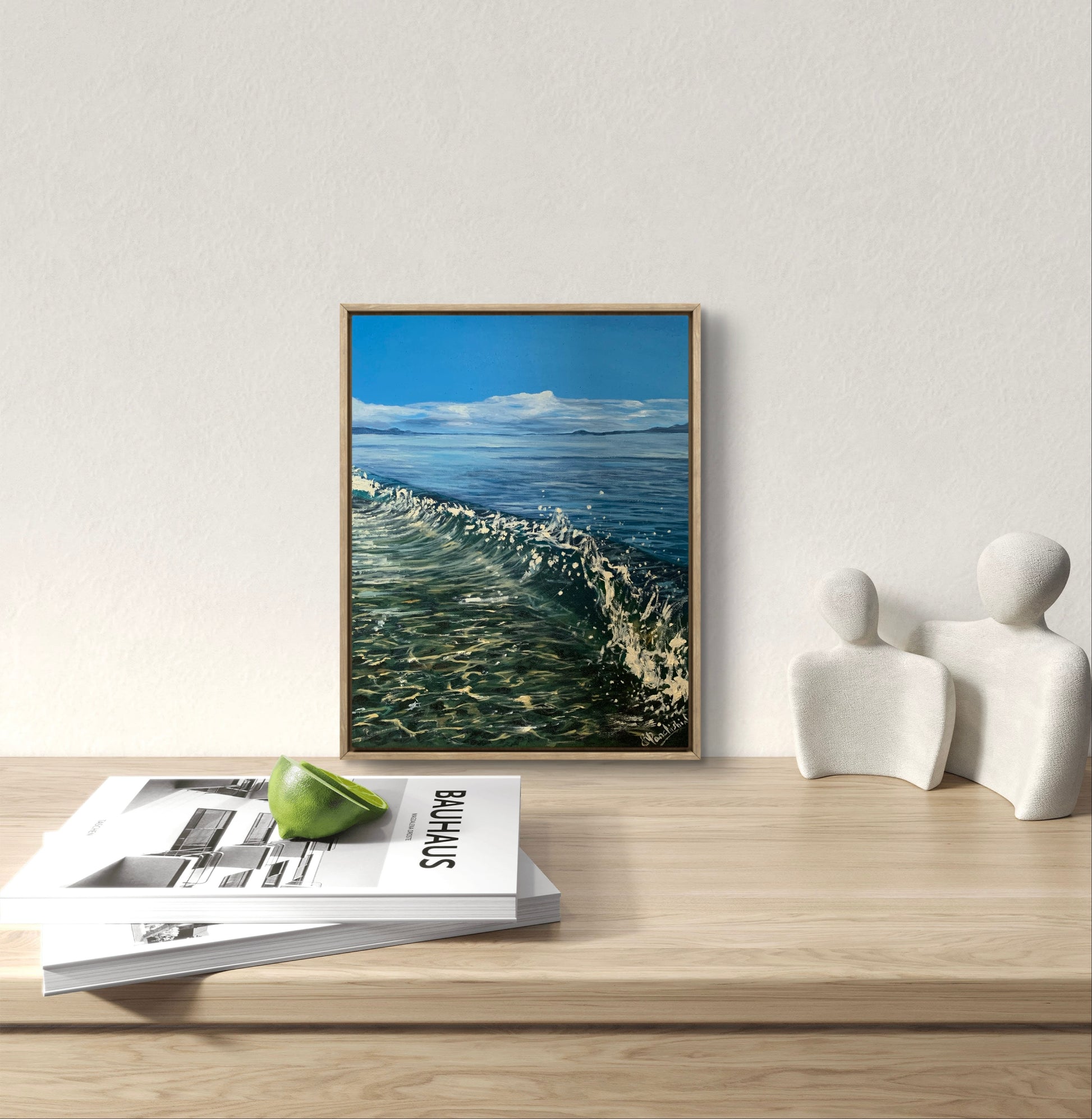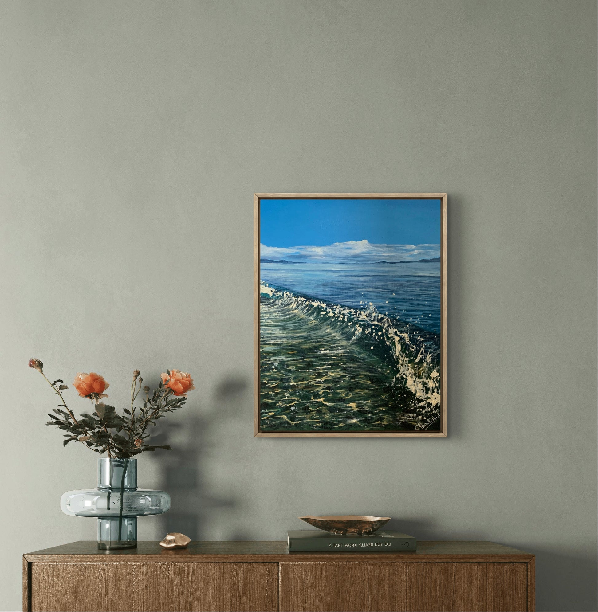 This painting captures a serene seascape, focusing on a cresting wave in the foreground with remarkable detail and vibrant splashes of white foam. The contrast between the dynamic motion of the wave and the tranquil horizon evokes both energy and peace.