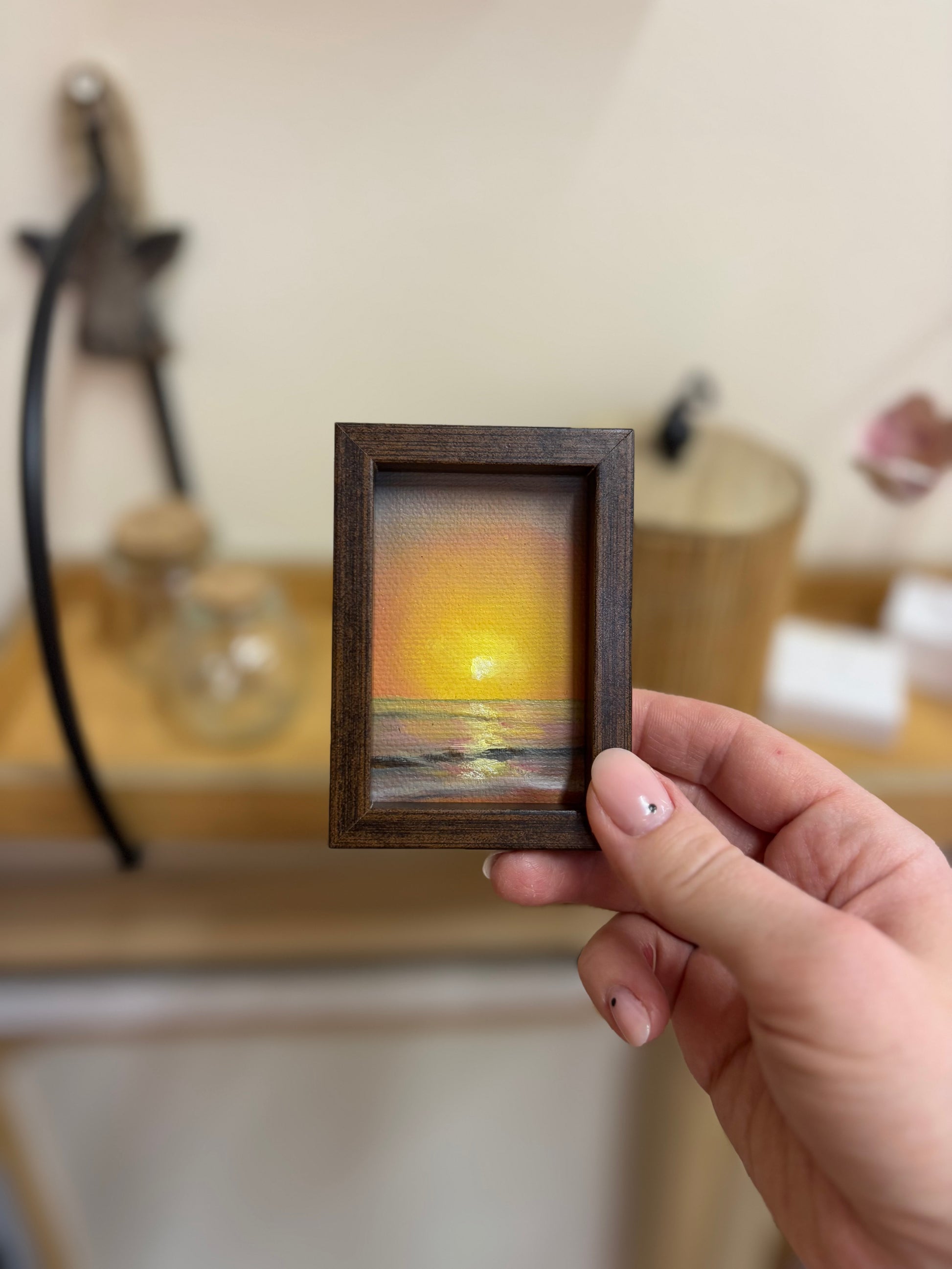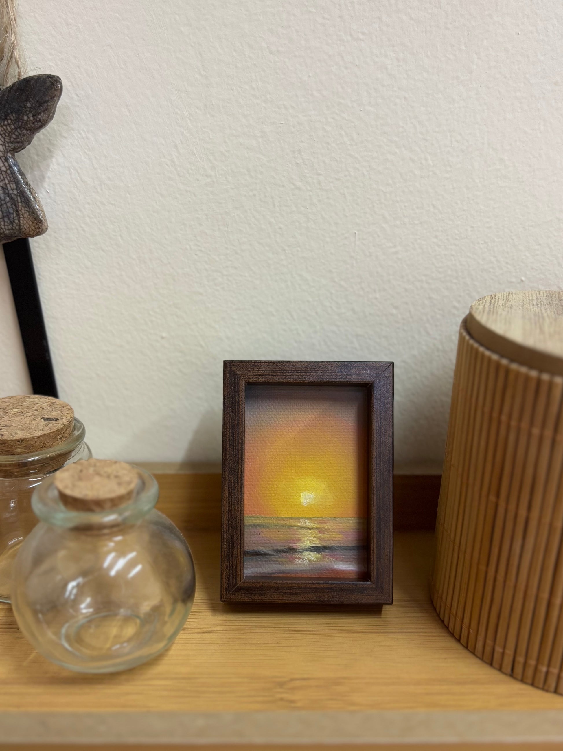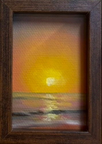 A radiant sunrise bursts with color, from deep purples to glowing yellows. This piece celebrates the beauty of each new day in a compact, collectible size..