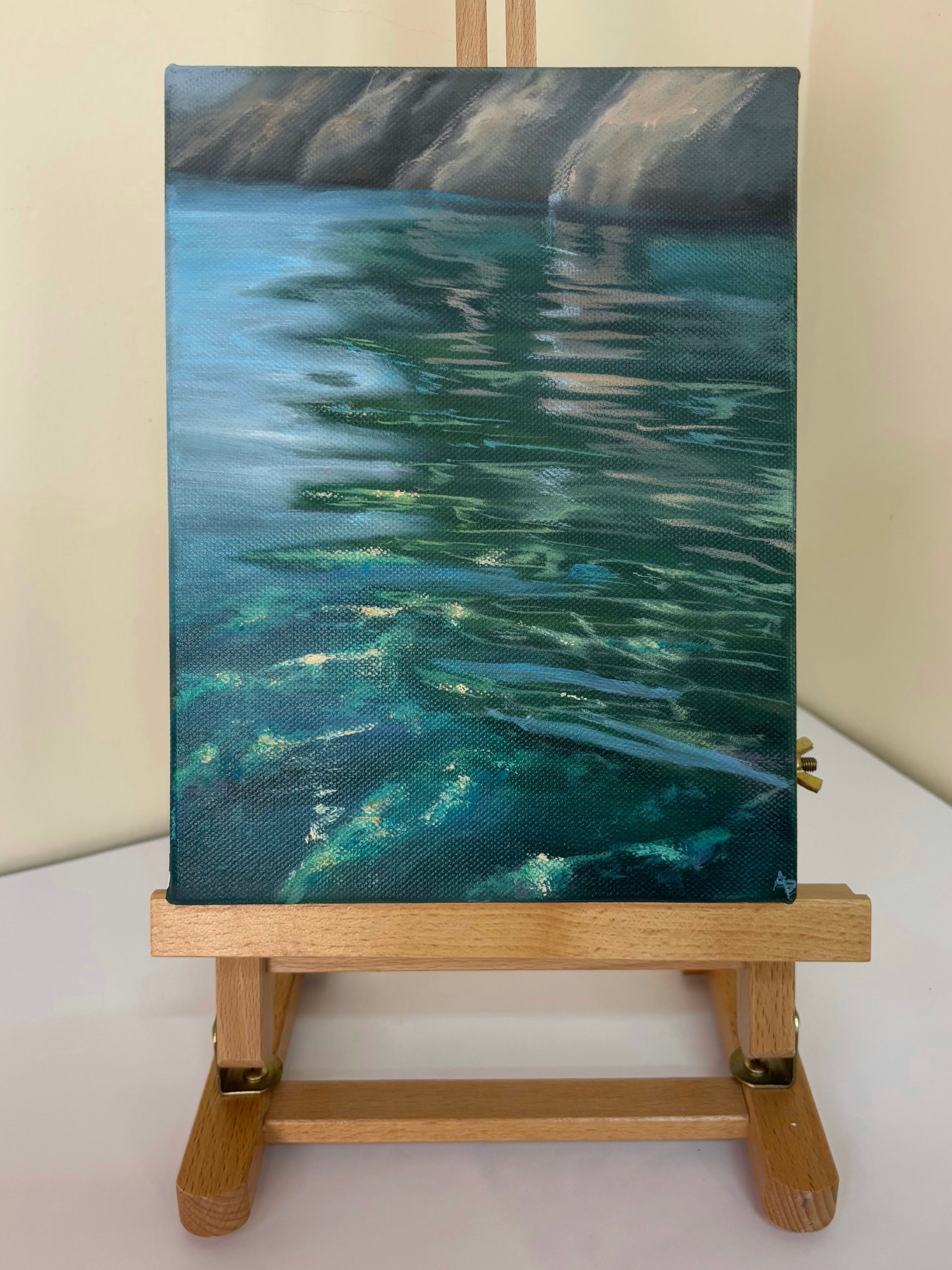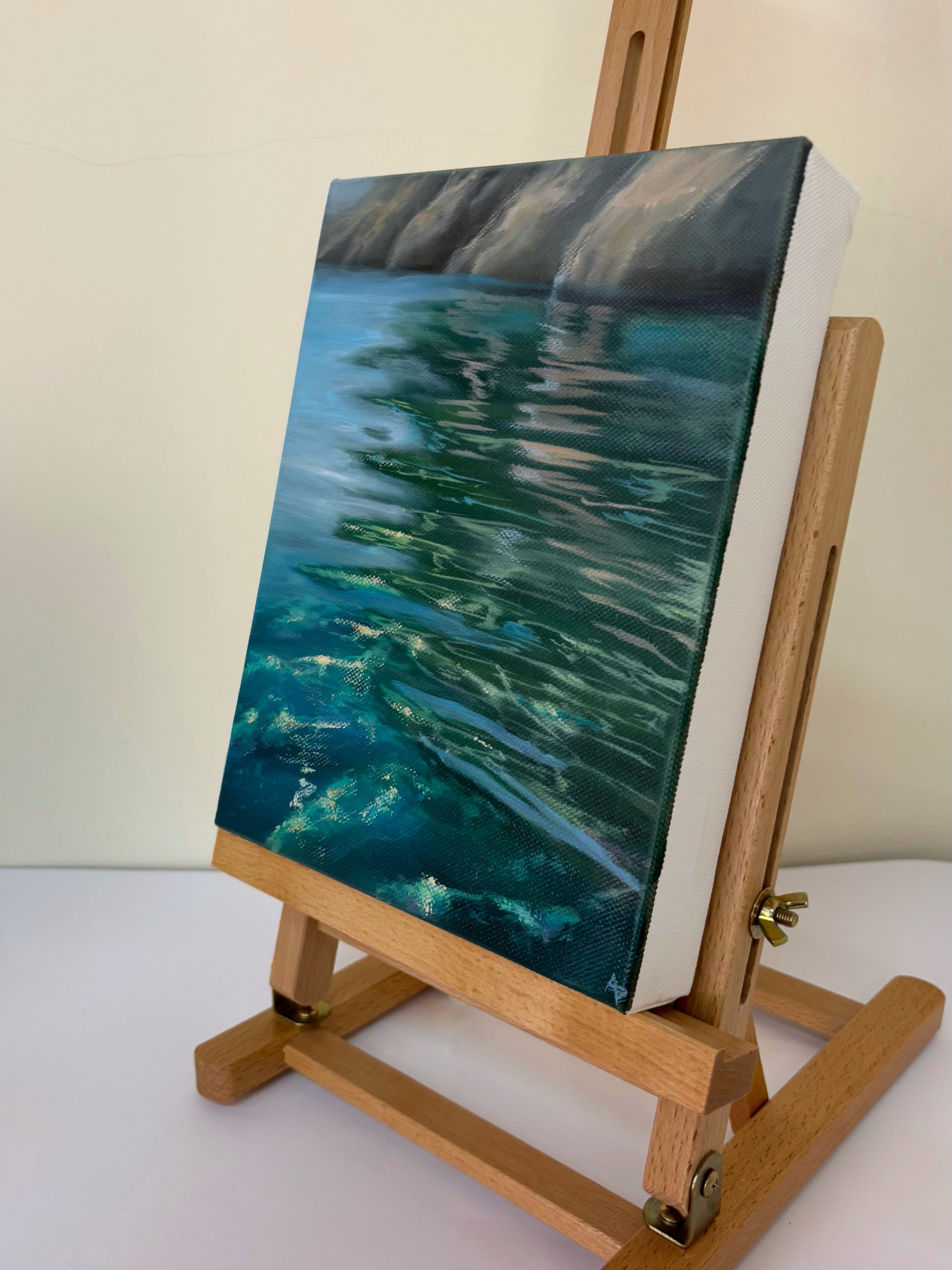 Gentle ripples move across emerald-green water, reflecting the surrounding cliffs and light. The painting invites you to pause and breathe, immersing yourself in the quiet beauty of the sea’s surface.