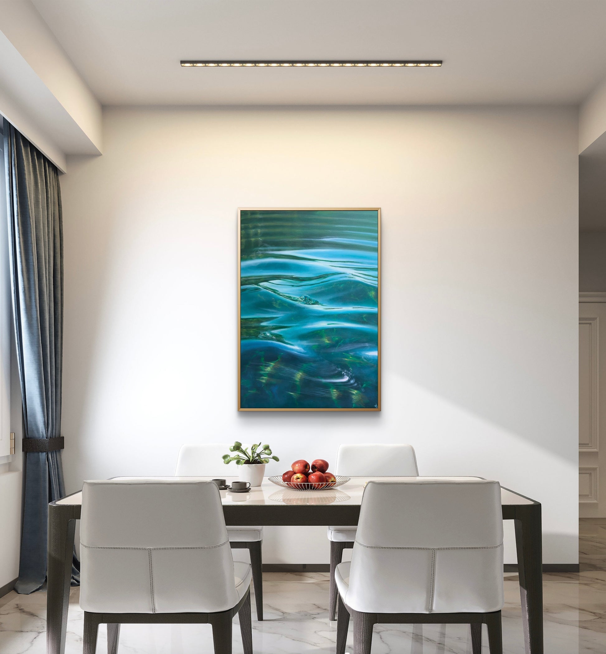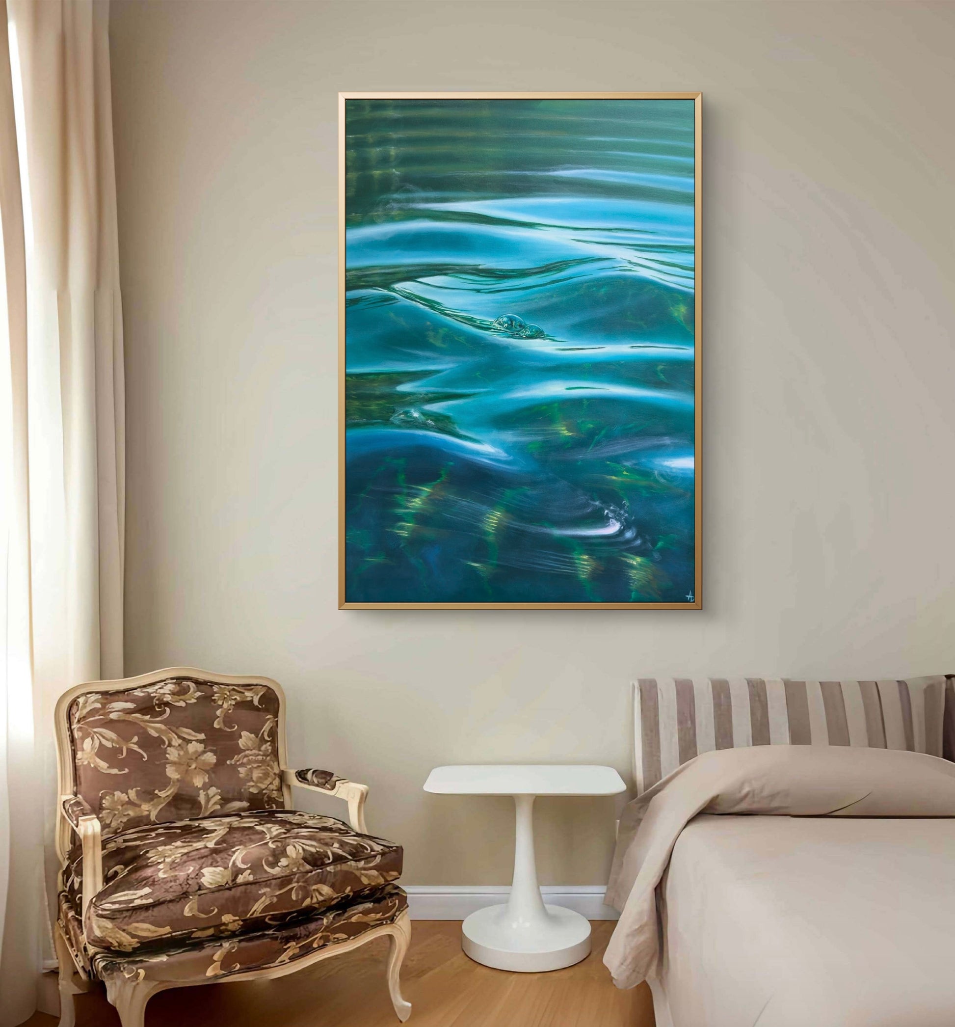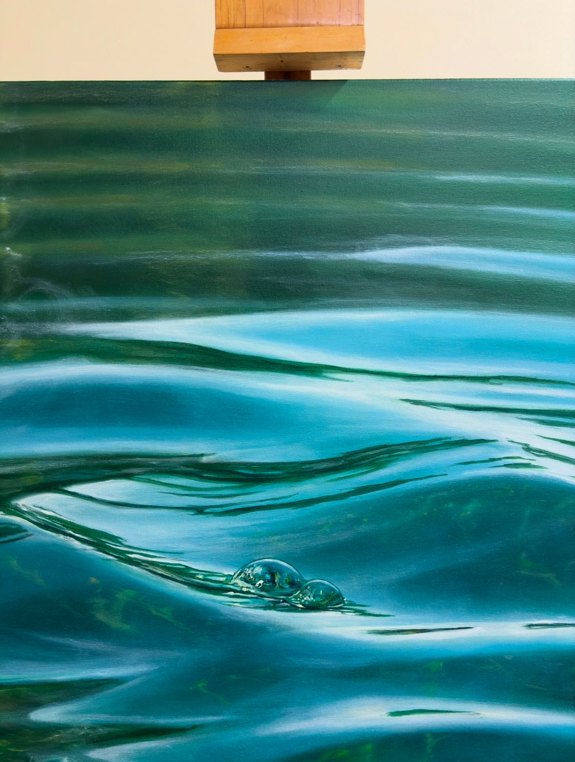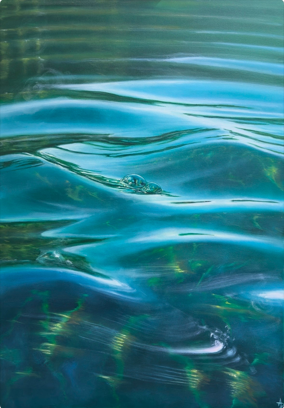 Calm, transparent water in soft green-blue tones fills the canvas with stillness and quiet depth. Two delicate bubbles rest on the surface, adding a subtle sense of life and fragile balance.