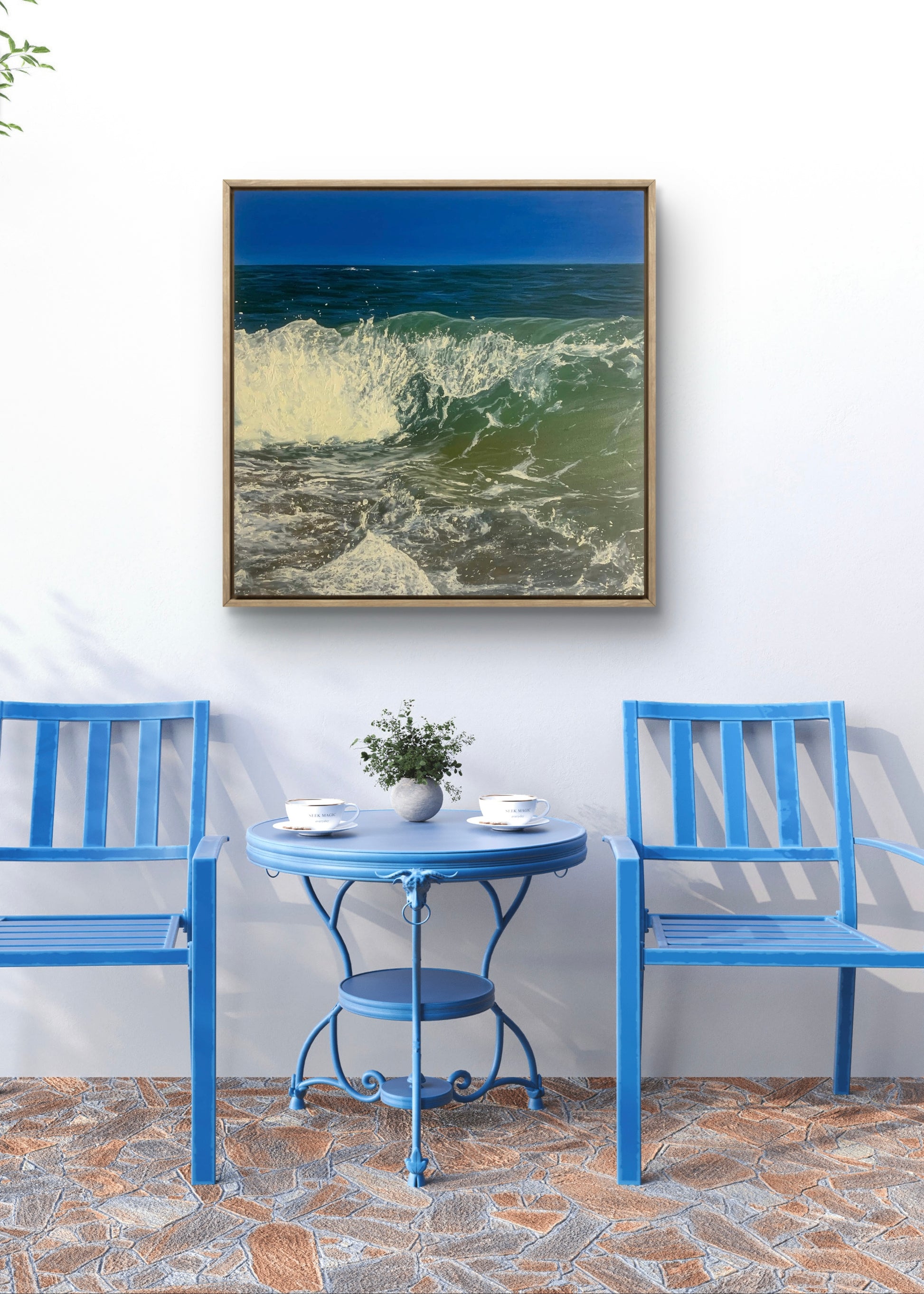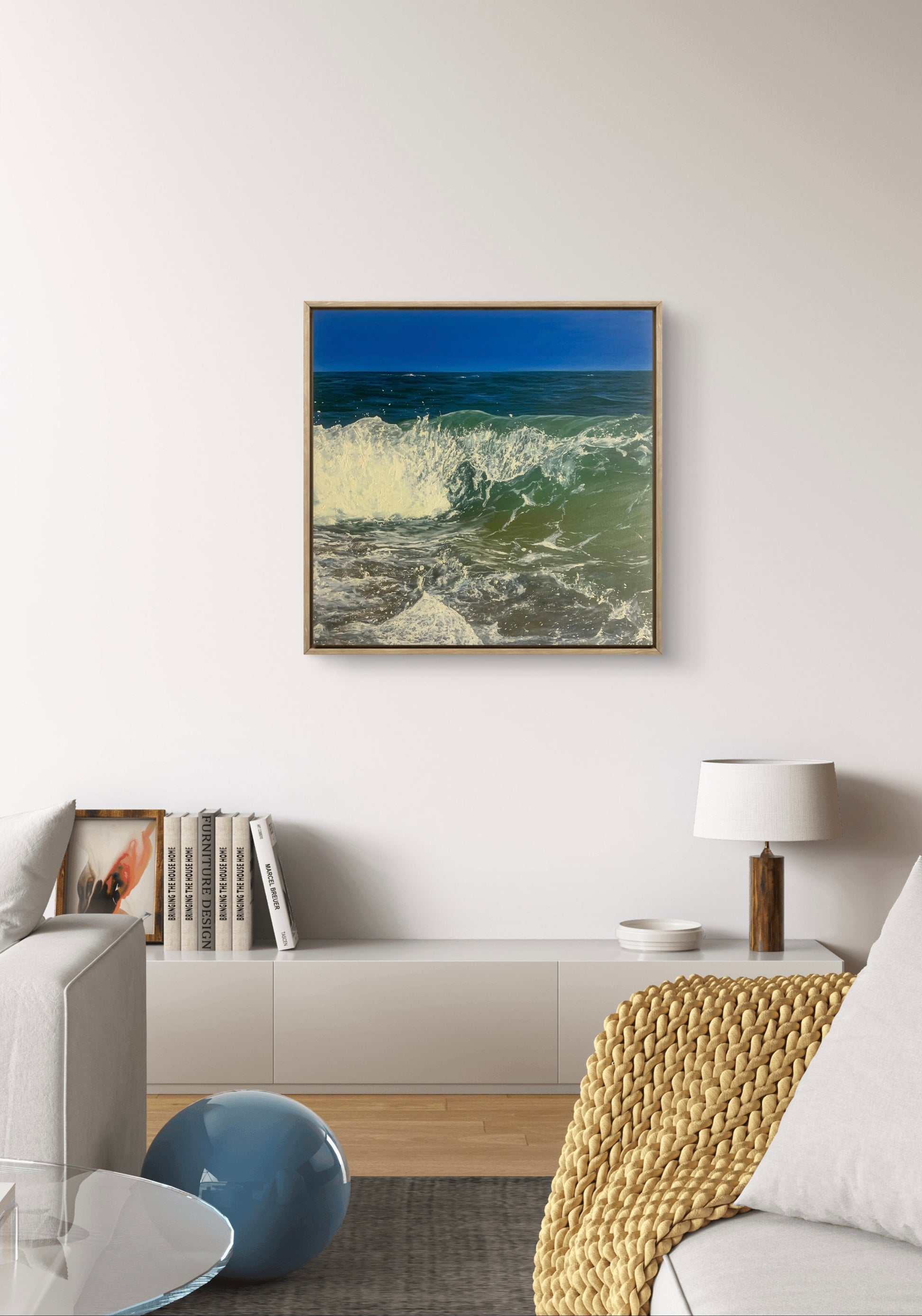 This oil painting captures the graceful motion of a wave in rich green-blue hues, reflecting the ever-changing colours of the sea. Fluid brushstrokes and layered textures bring depth and serenity to the scene