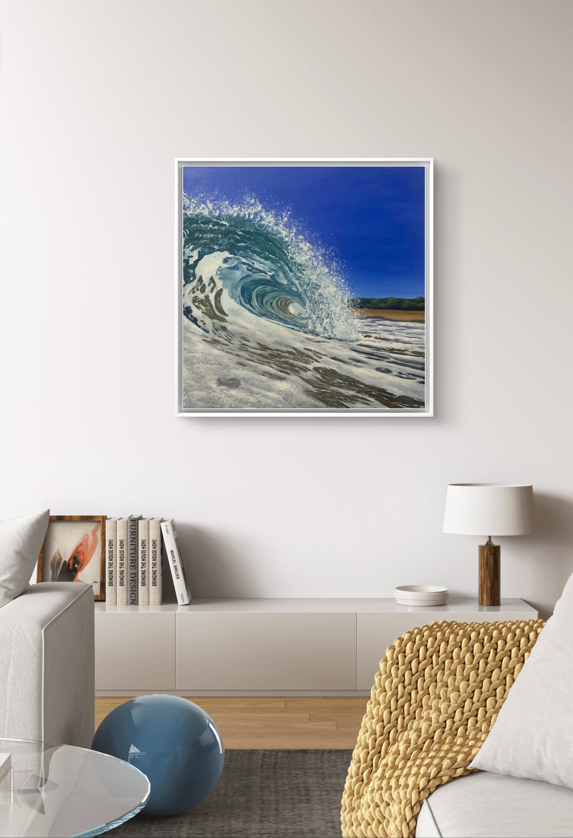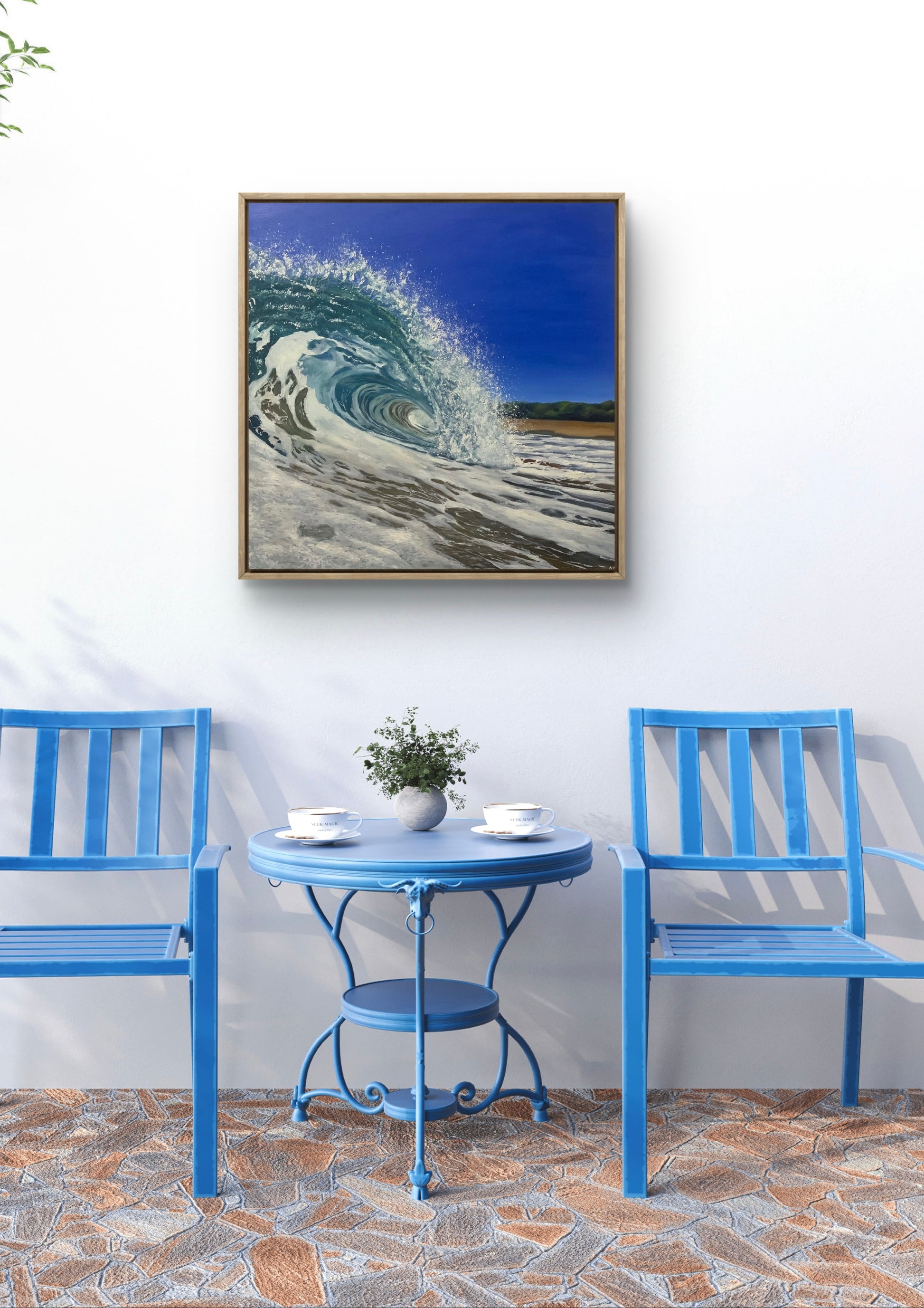 This oil painting features a turquoise sea wave rolling gently beneath a clear blue sky. the vibrant colours and smooth textures evoke a sense of calm and coastal freshness